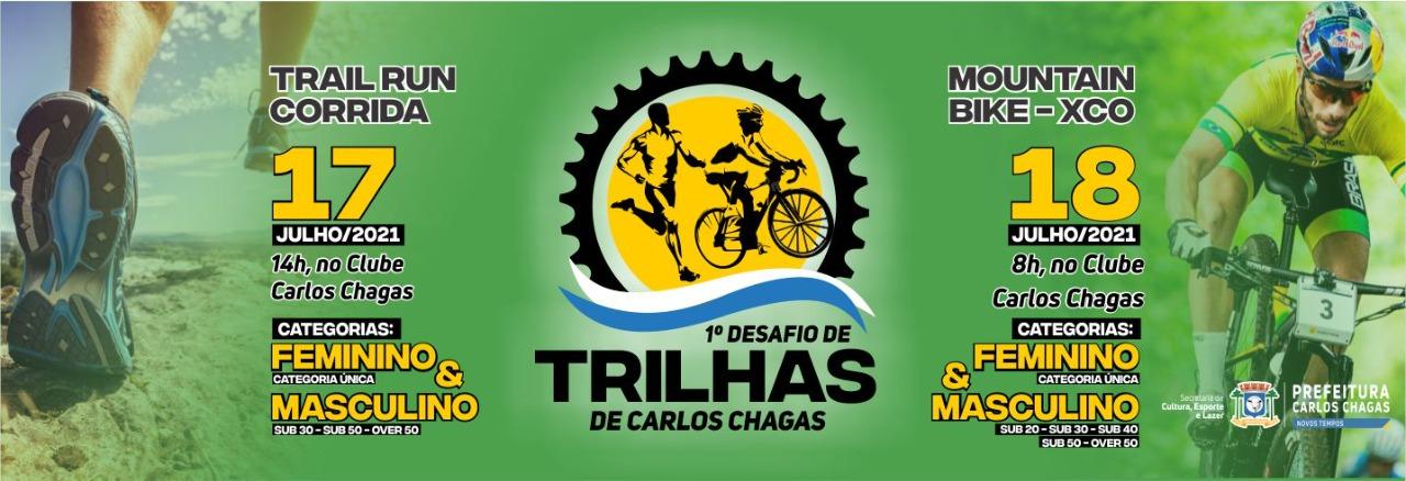 1° Desafio de Trilhas de Carlos Chagas - MG (Mountain Bike - XCO) Data: 18/07/2021 Horário da largada: 08:00h Categorias: Sub 20- Sub 30 - Sub 40 - Sub 50 - Over 50 e Feminino - (Pódio do 1° ao 5° colocado) Premiação em dinheiro para os três menores tempos da volta pelo App Strava. Inscrição: 2Kg de alimento não perecível. Local de largada: Clube Carlos Chagas