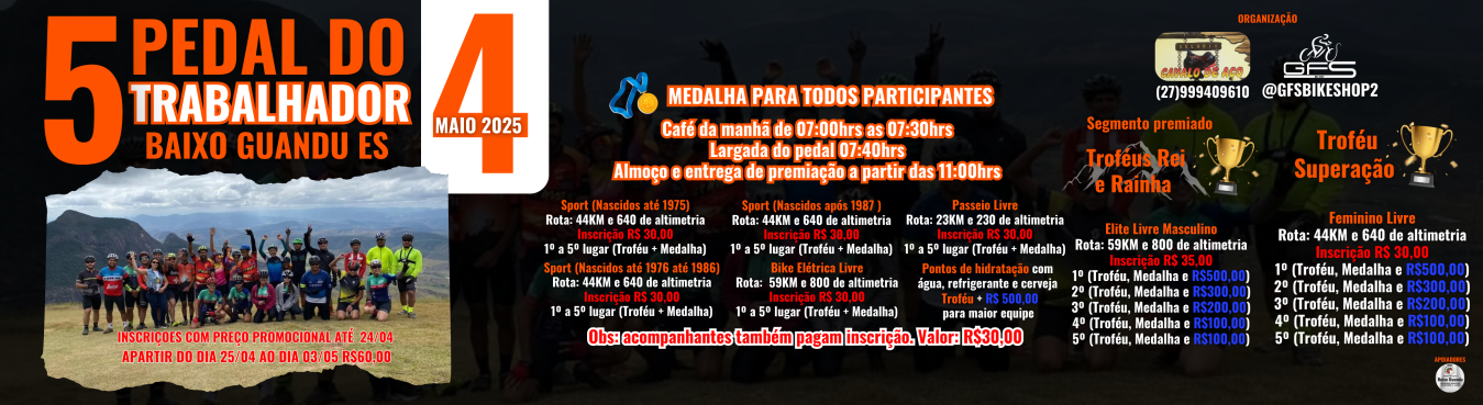 *Organização:* Selaria Cavalo de Aço, sob a direção de Roger. - *WhatsApp da Organização:* +55 27 99940-9610. GFS Bike Shop. - *WhatsApp da GFS Bike Shop:* +55 33 99951-2913. --- *Divirta-se e pedale com segurança!* A organização do *5º Pedal do Trabalhador* deseja a todos os participantes um excelente evento, repleto de superação e diversão. Contamos com a colaboração de todos para que o evento seja seguro e memorável. *Equipe Organizadora* 5º Pedal do Trabalhador - 4 de Maio de 2025