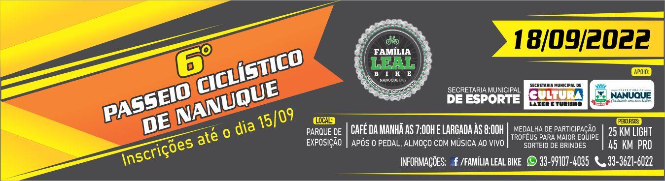 6º Passeio Ciclístico de Nanuque MG terá um delicioso café da manha as 7:00hs a largada para o passeio será as 8:00hs onde haverá 2 percurso sendo o Sport 25km e o Pro 45km, teremos apoio durante os percursos, ponto de hidratação para os ciclistas, após o passeio teremos um delicioso almoço com musica ao vivo e sorteio de brindes.